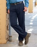 Lower rise work pants constructed with an interlined waistband with easy button closure